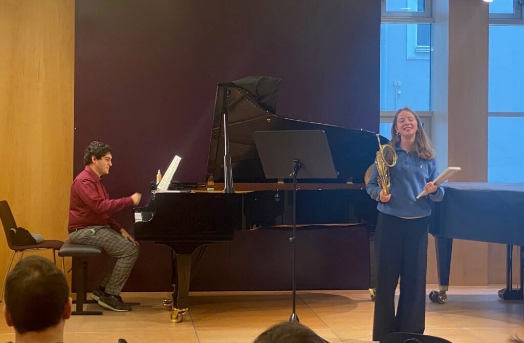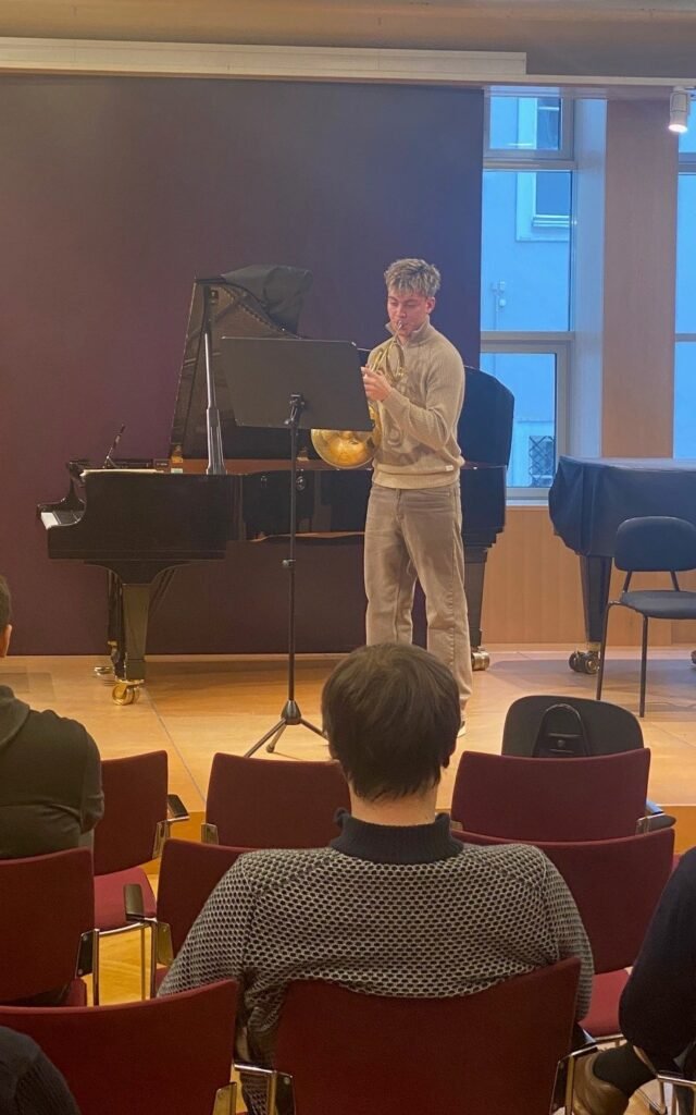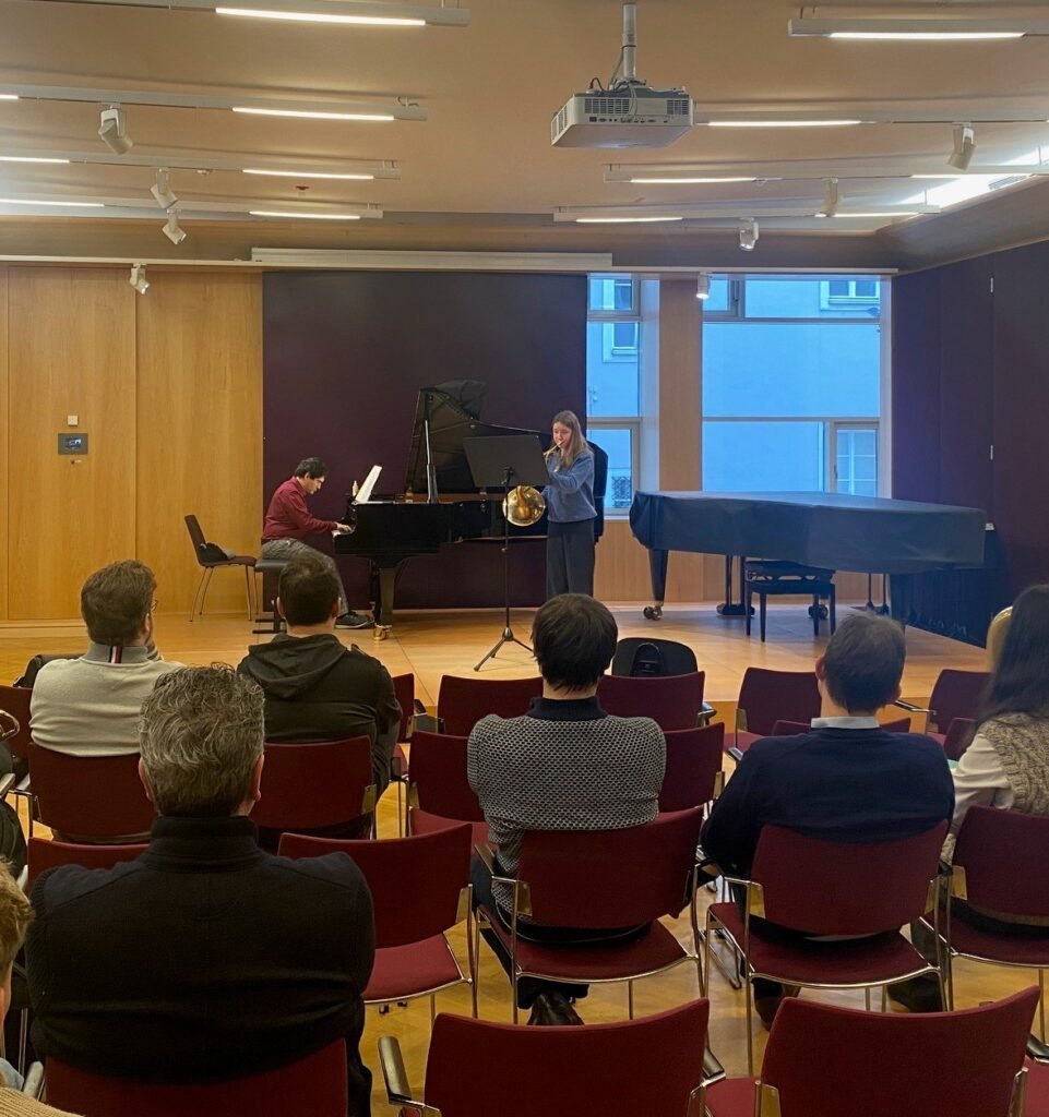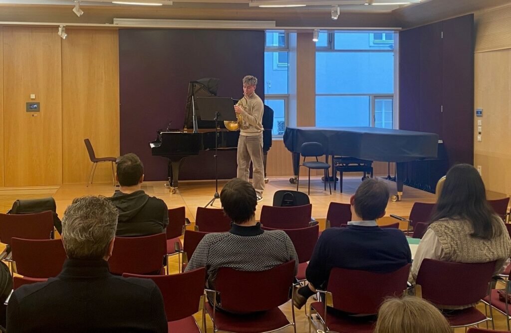 Am Samstag, den 31. Jänner fand an der Universität für Musik und Darstellende Kunst Wien ein Aktionstag für Blechbläser*innen statt. Ziel dieser Veranstaltung war es, dass Musikschüler*innen mal in eine Universität hineinschnuppern können und sich Feedback von den dortigen Lehrbeauftragten holen können. Von der Musikschule Staatz haben sich zwei Hörner gemeinsam mit ihrem Lehrer Peter Hofmann auf nach Wien gemacht, um an diesem Tag teilzunehmen. Zwei Hörner – mit unterschiedlicher Motivation: Tobias Lehner möchte demnächst seinen Grundwehrdienst bei der Militärmusik NÖ absolvieren und wollte den Aktionstag als Übung für die Aufnahmeprüfung in St. Pölten nutzen und natürlich Tipps dafür mitnehmen. Stephanie Gahr – die neben dem Hornspiel auch leidenschaftliche Sängerin ist – wurde von ihrem Lehrer einfach mal dazu ermutigt, die Welt der Musiker*innen und Musikstudent*innen kennenzulernen.